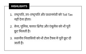 देशभर में किसी भी हाइवे या एक्सप्रेस वे पर वाहन से चलने पर सरकार की तरफ से कुछ विशेष कैटेगरी के लोगों को टोल टैक्स में छूट दी गई है। इसमें देश के राष्ट्रपति, उप-राष्ट्रपति, प्रधानमंत्री, मुख्य न्यायमूर्ति, राज्यपाल, उप-राज्यपाल, संघ के मंत्री, राज्यों के मुख्यमंत्री, हाई कोर्ट के न्यायमूर्ति, राज्यसभा के सभापति, लोकसभा अध्यक्ष, राज्य विधान परिषद के सभापति, राज्य विधान सभा के अध्यक्ष, उच्च न्यायालय के मुख्य न्यायाधीश और अन्य न्यायाधीश, राज्यों के मंत्री, सांसद, भारत सरकार के सचिव, राज्य सभा और लोक सभा के सचिव, राज्यों की विधान सभा और विधान परिषद के सदस्य और सरकारी दौरे पर आए उच्च पदस्थ विदेशी व्यक्ति शामिल है।