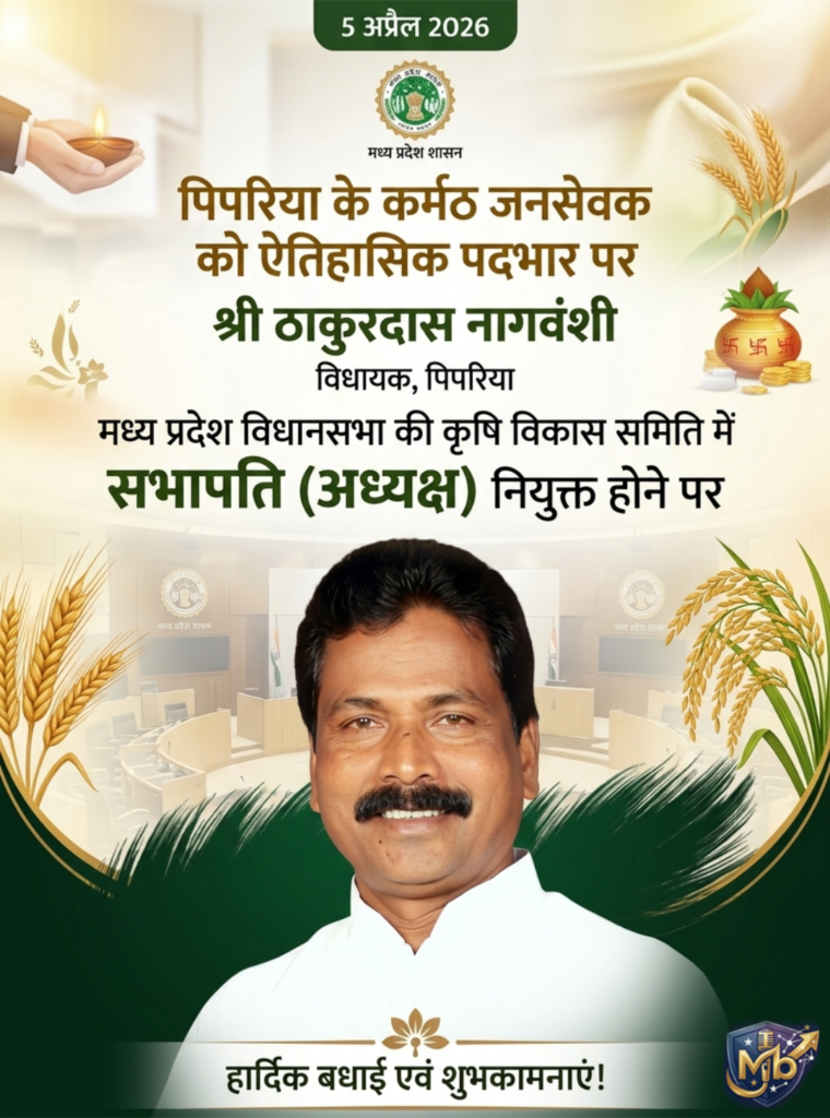 पिपरिया, नर्मदापुरम l पिपरिया तहसील से निरन्तर 4 पंच वर्षीय विधानसभा के विजयी विधायक श्री ठाकुरदास नागवंशी जी को 5 अप्रेल 2026 मे भोपाल मे उनकी कर्मठ कार्यशैली और सेवाओं को देखते हुए उन्हें किसान विकास समिति का अध्यक्ष नियुक्त किया गया l उन्हें स्थानीय समाज, संस्थाओं और व्यक्ति विशेष द्वारा निरंतर बधाइयाँ और संदेश प्राप्त हो रहे हैं l