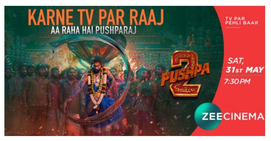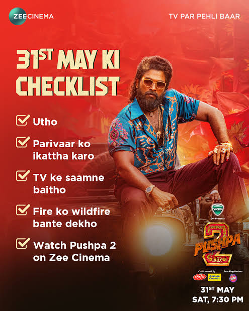 ‘पुष्पा 2: द रूल’ का वर्ल्ड टेलीविज़न प्रीमियर 31 मई, शनिवार को शाम 7:30 बजे, सिर्फ ज़ी सिनेमा पर होगा। तो तैयार हो जाइए, अपनों को साथ बैठाइए और देखिए ‘पुष्पा 2: द रूल’ का धमाकेदार वर्ल्ड टेलीविज़न प्रीमियर।
