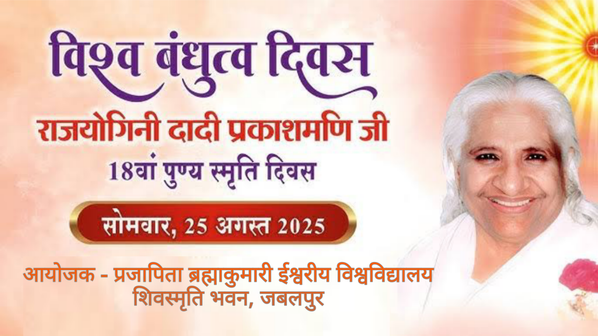 प्रकाशमणि जी की 18 वी पुण्य स्मृति दिवस 25 अगस्त 2025 को शिव शक्ति भवन शक्तिनगर जबलपुर सेवाकेन्द्र पर बी के ज्योति बहन एवं समस्त बी के भाईयों और बहनो द्वारा दादी जी को श्रद्धांजली पुष्पांजलि अर्पित किया गया